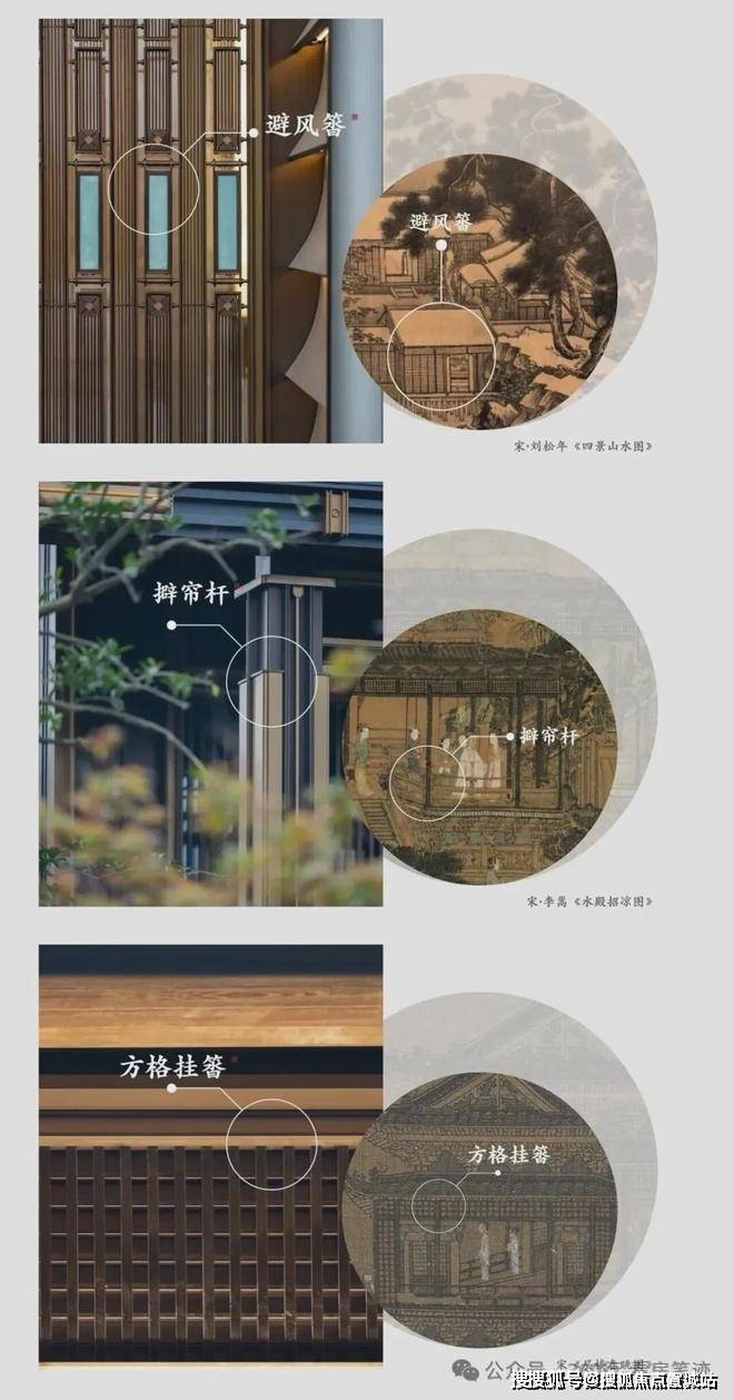 项目通过擗帘杆、方格挂沓、避风䈋、障日䈳、版引檐等20余处建筑细部符号转译,来体现"清新儒雅精致飘逸"的美学特征。这些细节,全部是通过对宋画和宋代诗词的深入研究而来,处处有自己的故事,经得起时间的推敲。