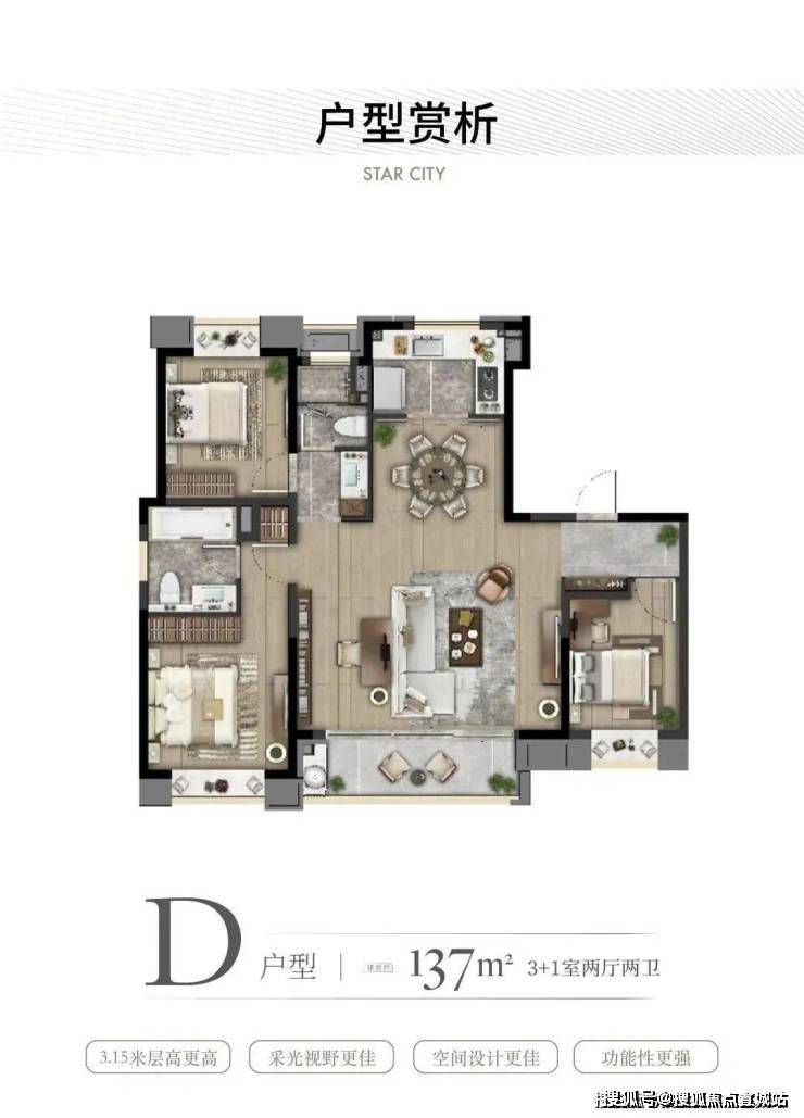 ·约137㎡户型:格局上做到了三开间朝南+南北通透,大尺度的奢阔横厅设计串联南向观景大阳台,整个公区的视野无比通透;主卧套房,保证了业主的尊崇感和私密性!