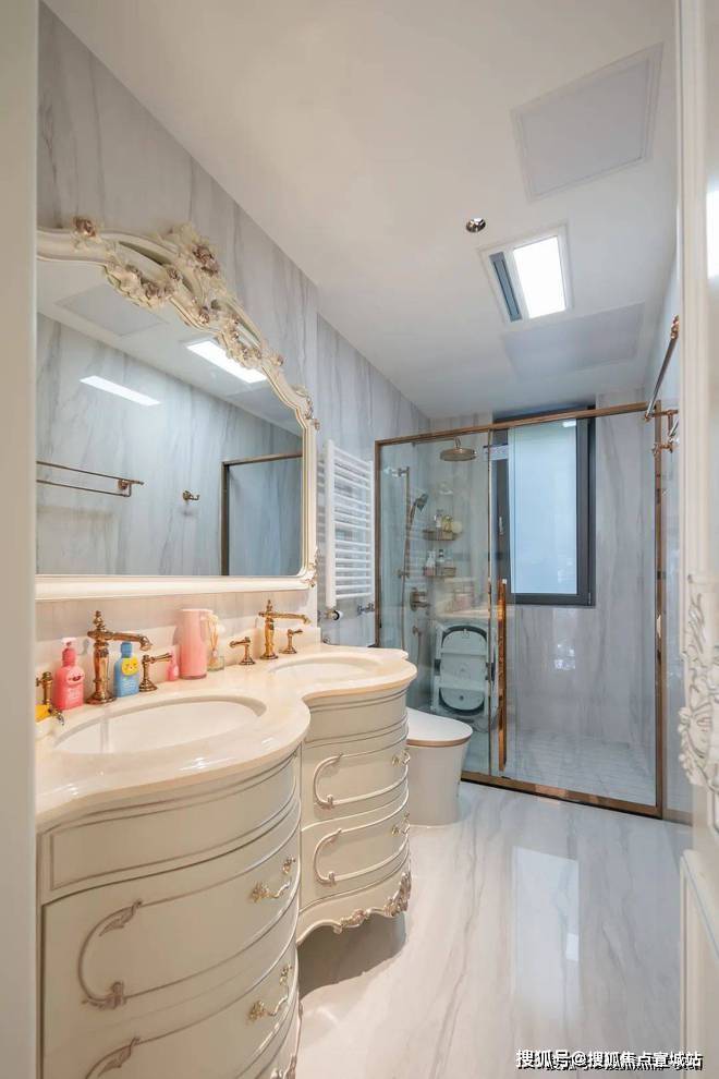 即便是私密的卫浴间,挚友也未曾忽略对美的追求。简一阿波罗灰墙地通铺,与质感水晶灯、法式风洗漱台相得益彰,展现出低调而高级的自然美感。