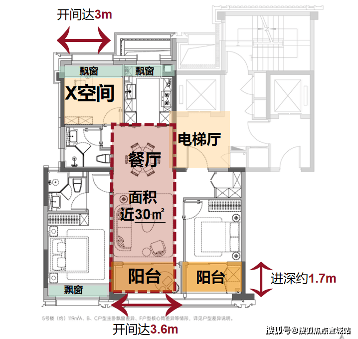 119㎡边户格局延续中户实用基因,北次卧焕新升级——270°转角飘窗,搭配约3.9米开间(含飘窗),将北向空间采光与视野拉至极致,真正实现“北卧平权”。