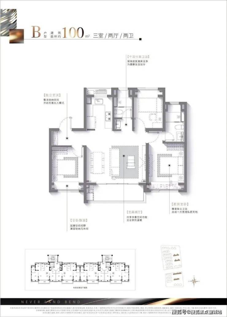项目建面约100㎡3房2卫仍然是优秀的飞机户型,但实现该面积段少见的 大面宽横厅设计!