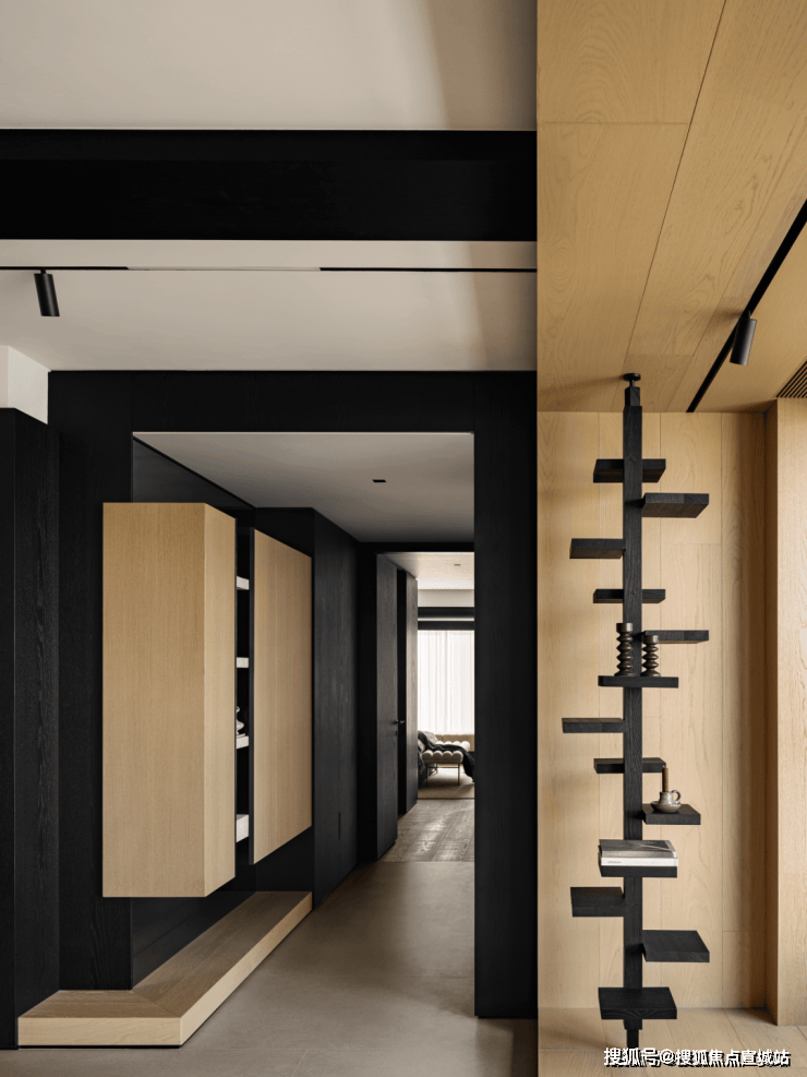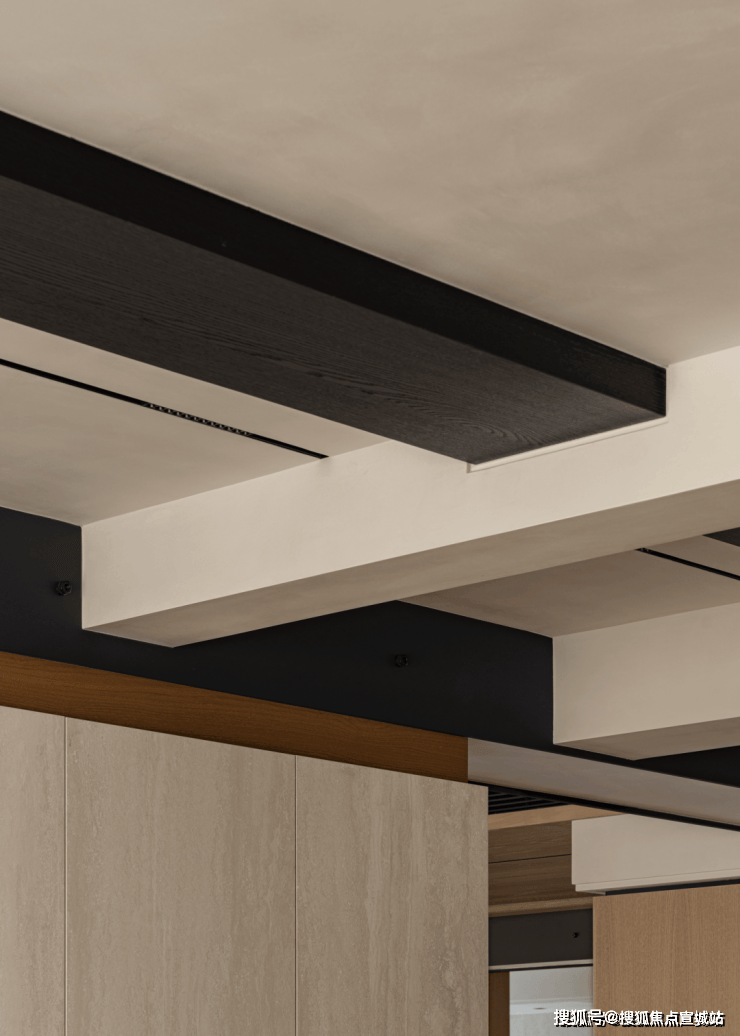 横梁与窗套的材质交织,深色木质的横梁从天花板延伸至空间的深处,带来结构的稳定感与力量感。