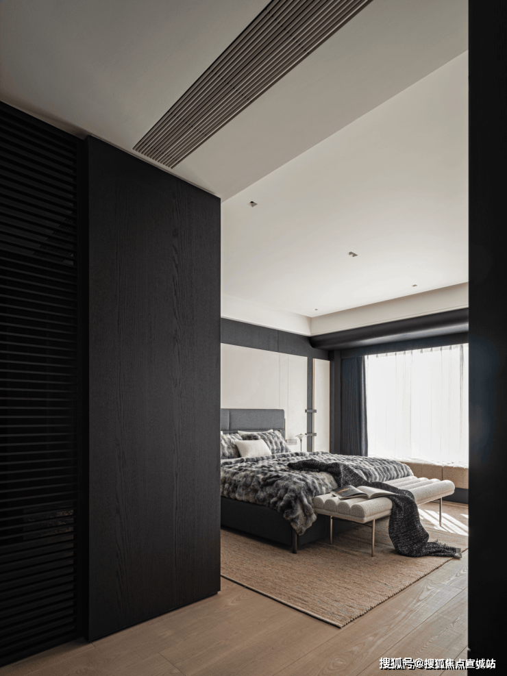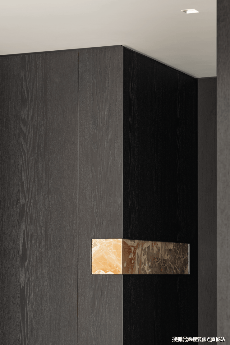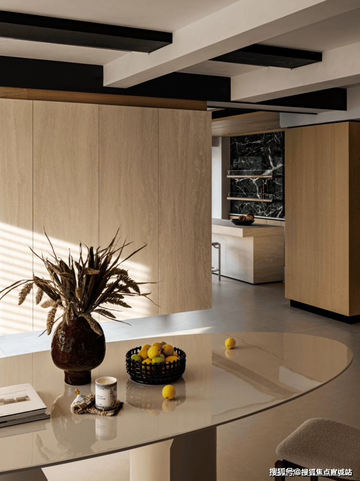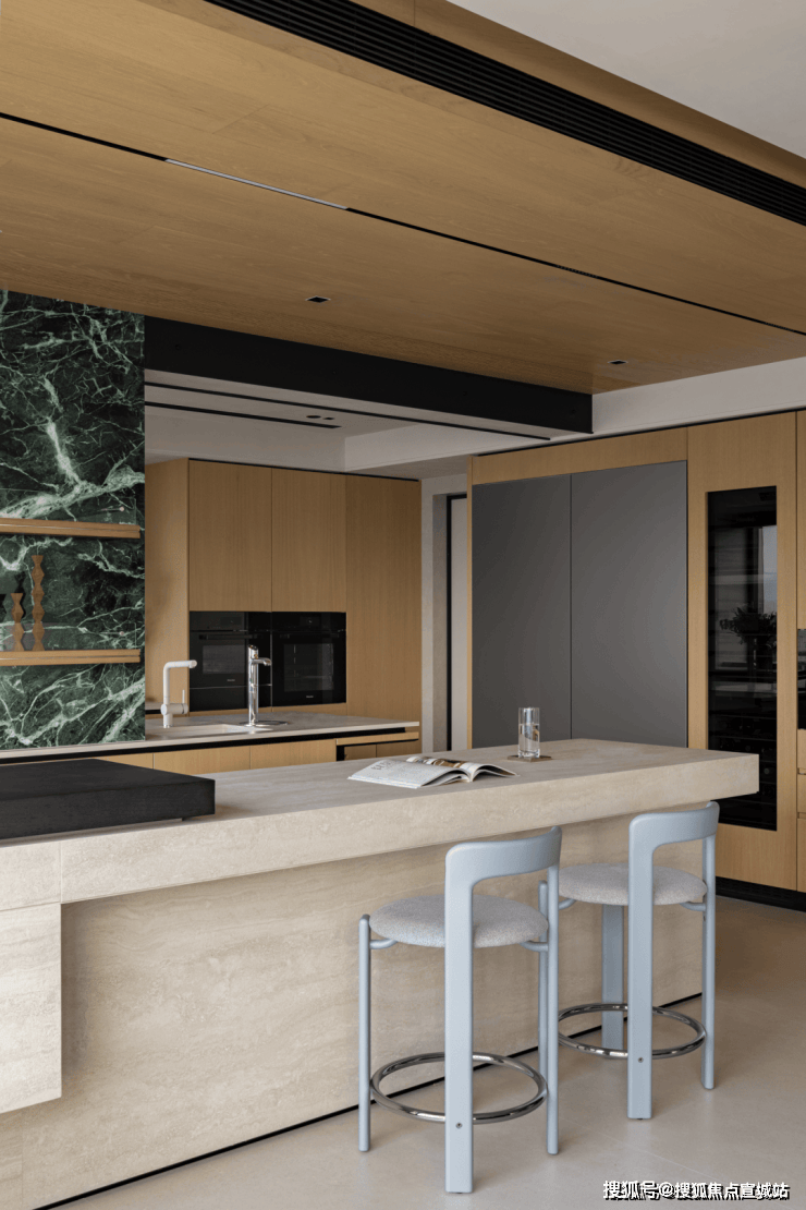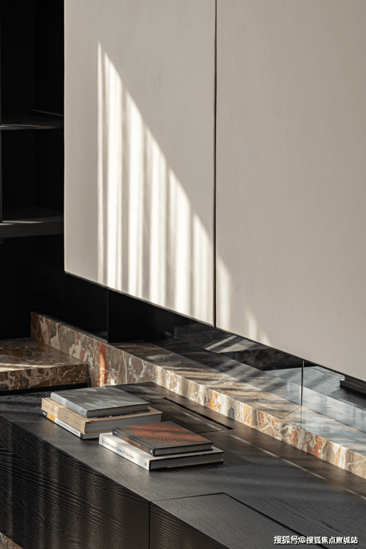 大理石的高低错落与墙面木作系统结合,织物的柔软形成构筑逻辑,沉稳与感性交融,构成一种独特的空间节奏。