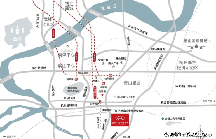 咫尺沪昆、绍诸高速,经风情大道1小时可达萧山主城,经时代大道1小时直抵滨江核心、钱江新城和西湖,通达八方,一览城市繁华。