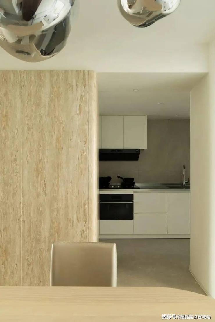 餐岛一体的组合,既满足了日常的功能需求,又在不经意间增添了隐形的收纳空间,避免了墙面柜体的直接储物功能,从而保持了空间的纯粹与宽敞。