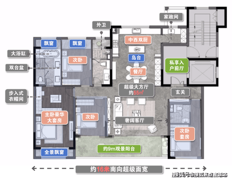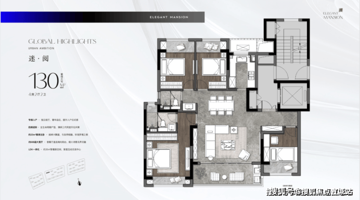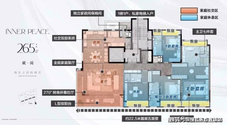 【户型亮点】私家电梯入户+独立入户玄关,私密性强。约5.6米的横厅+面宽约8.6观景阳台,采光、通风性能佳。双套房设计,让改善更彻底。