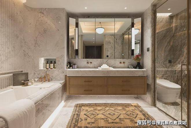 正对玄关的位置是主卫,地面墙面为巴西鱼肚灰,淋浴间为水云纱.五金品牌为GESSI,浴缸及智能马桶品牌为劳芬,定制镜柜里面配有美妆冰箱.
