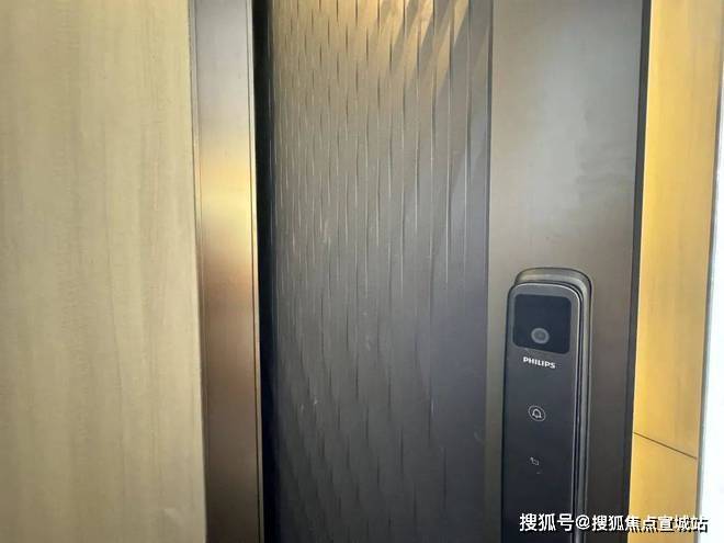 这个户型入户大门是子母门,铸铝装甲门,配飞利浦五合一门锁,这扇门正面看是带浮雕样式,另一面则是仿木纹,契合室内外的装修风格。