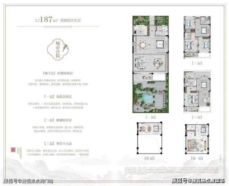 户型特色:合院享60-100㎡私家庭院,地下室层高5.6米,可改酒窖、影音室等;195㎡合院享9.6米南向面宽,270°露台。