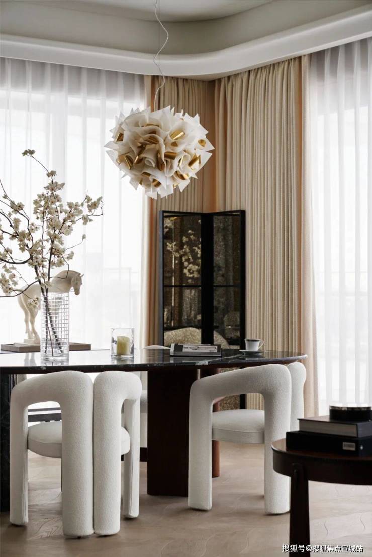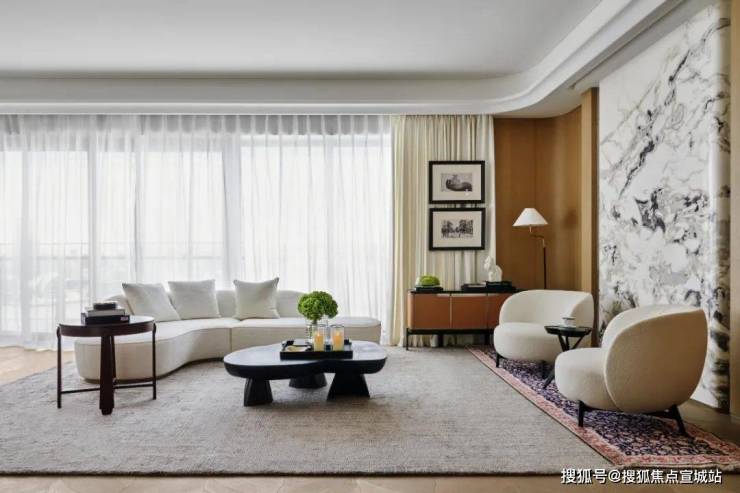 住宅呈现蝴蝶状的优雅造型,进口浅色花岗岩结合金属铝板形成像“飘带”线条曲线柔化了建筑边界,室内外交织出流动的江韵。