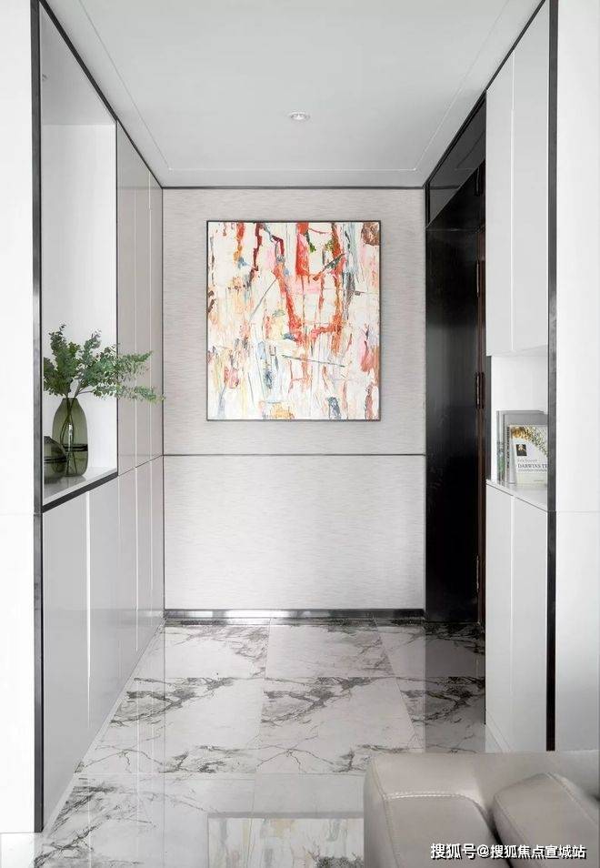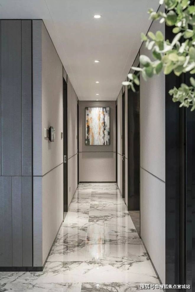 透过鞋柜看向过道,门全部做了到顶的处理,中间的腰线在公共开放区域是整体贯穿的元素,并结合柜门的开启高度,硬包的中线高度等等做了一个整体的联系。
