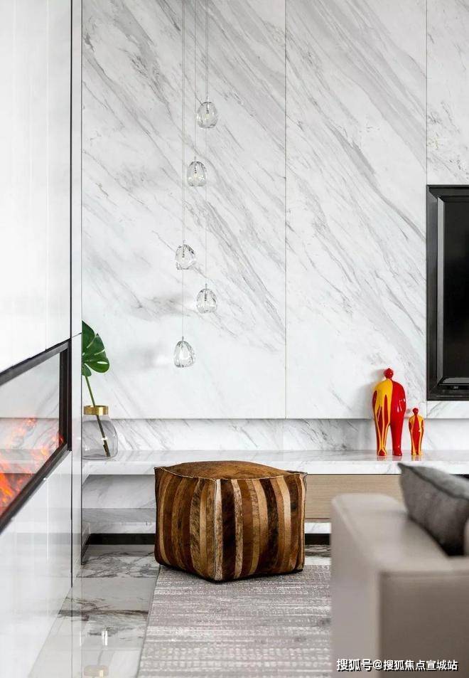 客厅角落的黄色皮凳丰富色彩呼应了壁炉的颜色。