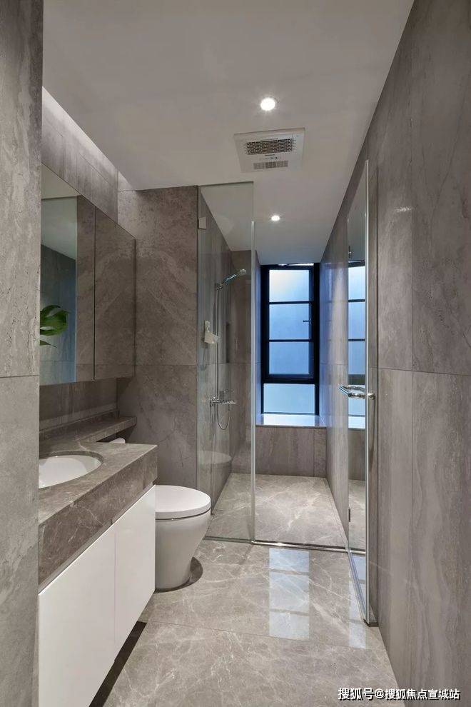 淋浴房做在内侧做了干湿分离的设计,保证了动线的流畅也不影响浴缸和马桶区域的视野。