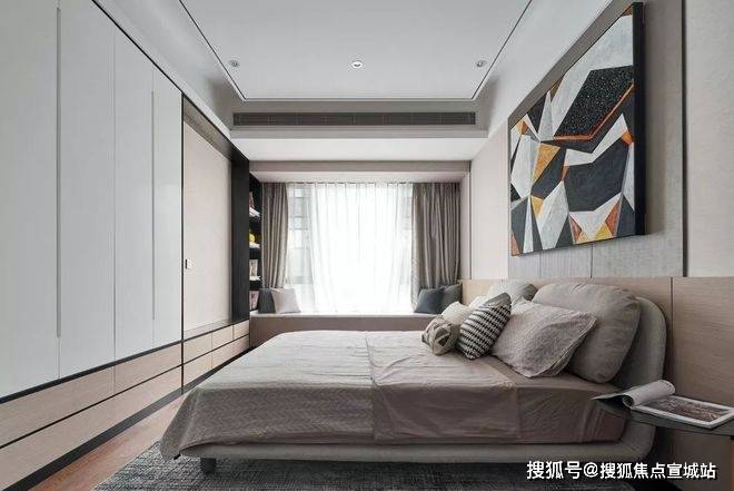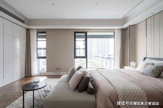 主卧的空间相对较大,背景是利用左侧的窗帘做的对称硬包的处理,其实后面有暗藏的灯带,使层次更为丰富一些,整体的家私和风格的感觉延续客厅,注重品质和空间的感受。