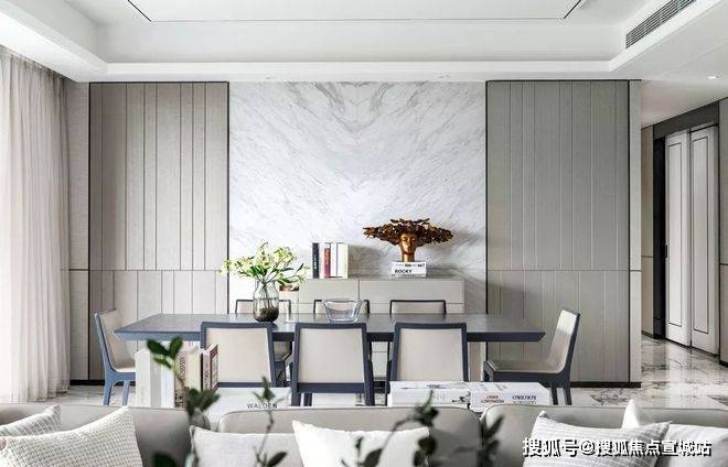 餐厅背景墙十分简单,用了简洁的理石和硬包分缝来做配合处理,餐边柜和餐椅的颜色呼应,深色的餐桌在浅色的空间处形成明度上的差异。