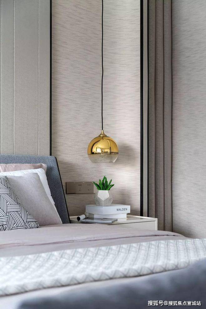 床头细节用了户型的设计,这样即让背景有了一个围合的感觉,弧形向上的高度让后面的硬包处多了一个灯带的位置,丰富了一些层次。