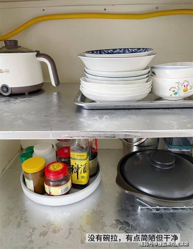 家里的底柜,主要用来收纳餐具和厨具,虽说十年前的装修碗篮还不太普及,但因为餐具量不算多,里面也有一定的留白,放起来倒是不乱也不挤,柜子上面再贴一层膜,平时擦拭清洁也很方便。