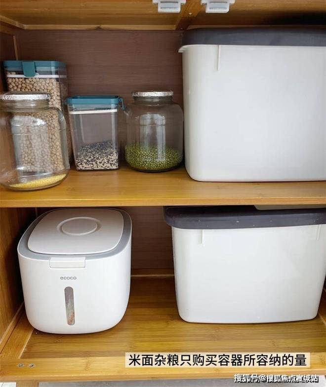 哦对,包括大米在内的各种粮食,也是都放在了米桶、罐头瓶、收纳盒里,且只准备不超过收纳容器的量,一般情况下一两个月补充一次就行,避免让柜内放得东西太多而导致拿取不便。