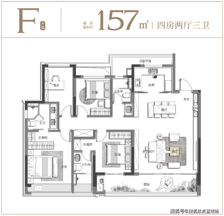 更值得称道的是,157户型配备双套房主卧设计,主卧自带独立卫浴与专属衣帽间,其中主卫采用双台盆设计,告别早晚洗漱拥挤的困扰,兼顾实用性与尊崇感;南向套房次卧,同样配备衣帽间与独立卫浴,可作为孩子或者父母的专属空间,让更多家人拥有独立舒适的居住空间。
