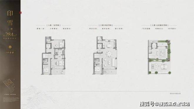 合院:建筑面积约 296-339㎡,中间套 296㎡为地上三层双主卧套房设计,边套 339㎡则三面环幕采光,主卧独占整层。