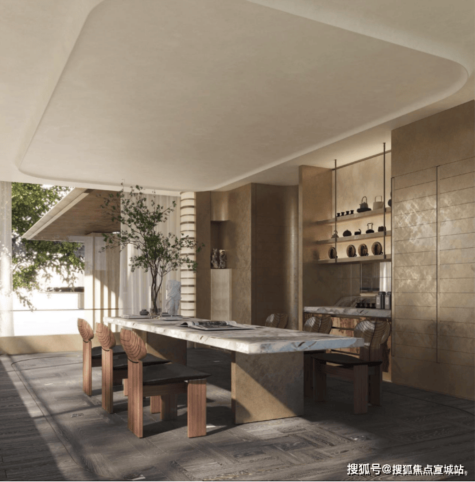 “回归之境”以3500㎡下沉水苑为核心,汇聚会客、泳池、茶室等多功能空间,形成仪式感十足的社区舞台。