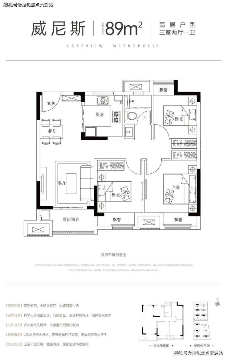 整个户型布局⽅正南北通透,采用科学人居动线设计,巧妙分区,生活井然有序。三开间朝阳的设计,保障了居所的通透性和采光性,让阳光充盈家的每个角落。