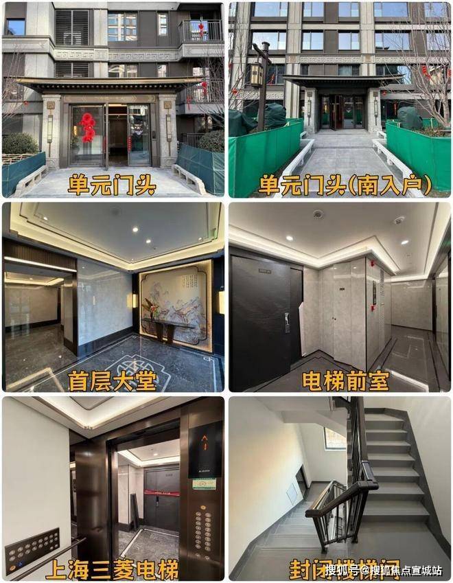 单元门头采用石材+金属铝板设计,首层及地下大堂均为拼花石材地面、中式山水壁画背景墙,质感在线;