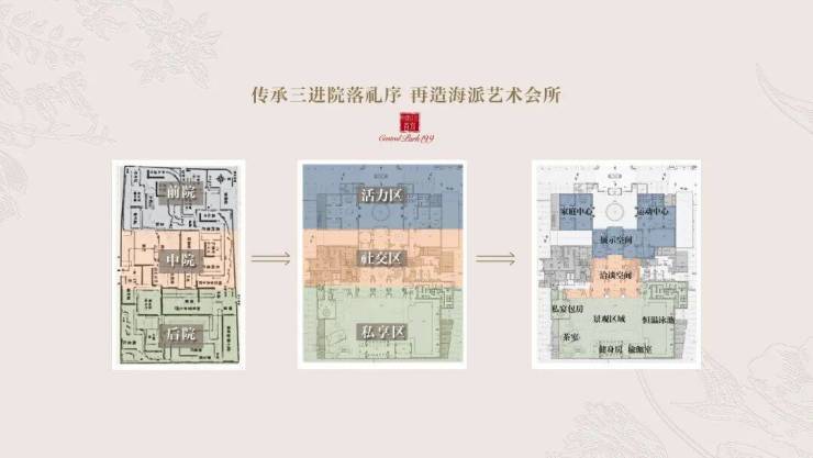 中建·玖上琅宸的会所的格局设计灵感来自于中国古典居住的三进院落,以活力区、社交区、私享区对应前院、中院、后院,真正做到了活动动线分明,移步一景。