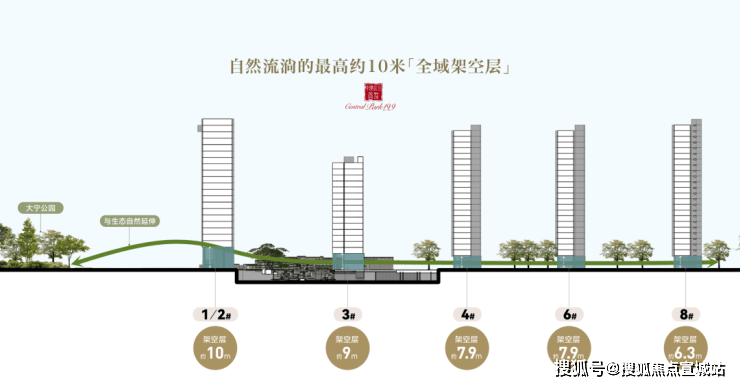 为了最大化内外景观视野,整个社区规划了行业标准内出挑的一层架空层,最高的10米,主体7.9-9米,最矮的也有6.3米。