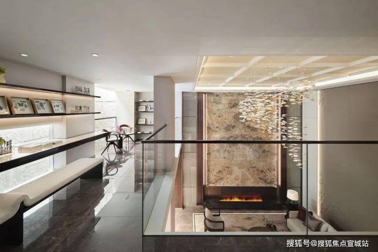地下空间,以古时的「雅集」为灵感,打造了一个氛围柔和舒适的休闲娱乐空间,挑空的设计,让空间显得大气非凡,顶面延续了之前紫禁明月中的方格金箔顶,墙面的大块水墨玉石,宛若矗立山林间。