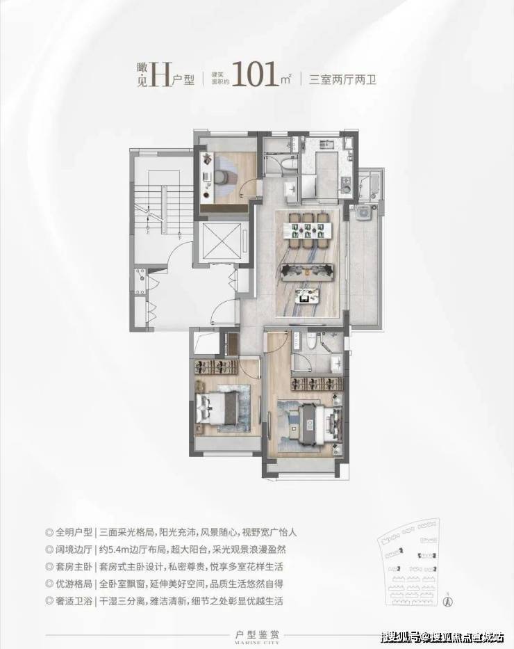 ③建面约101㎡H户型:三面采光,全能景观王炸边厅户型!