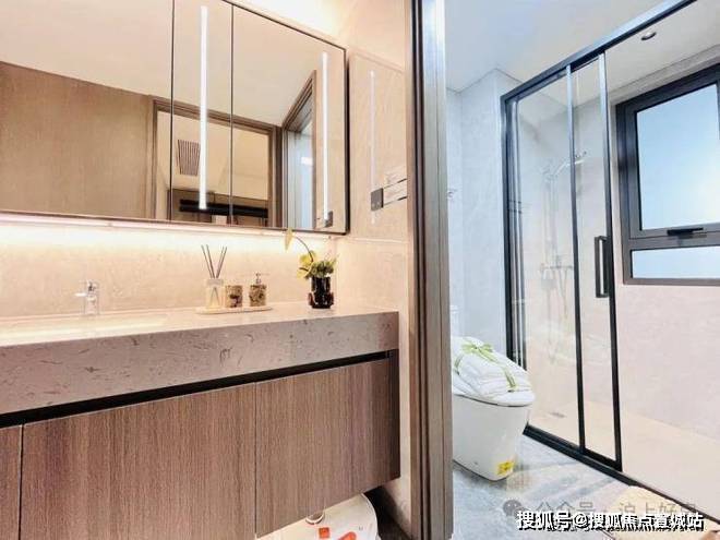 在细节上同样不遗余力。比如入户后的玄关柜是交付标准,打开厨房柜体、镜柜等各类收纳空间时均有惊喜;再如客厅和主卧均采用弧形吊顶,还有风暖浴霸、玄关顶面感应灯等细节,都透露出项目对品质生活的追求。