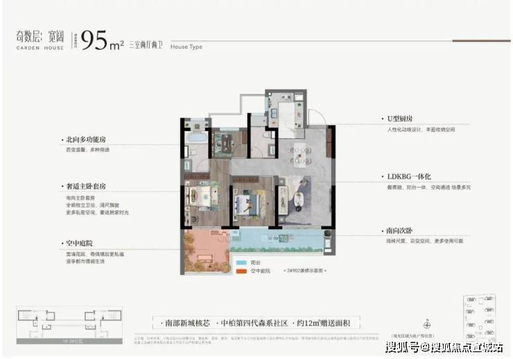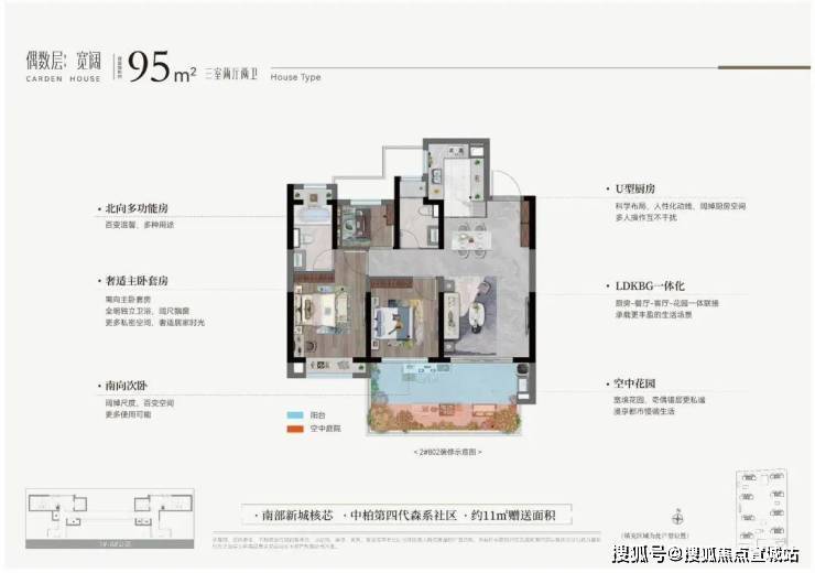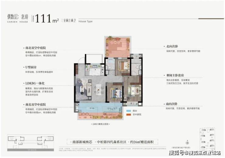 维度核心亮点定位第四代森系社区设计创新奇偶层错位庭院布局(奇数层南向/270°转角,偶数层南北双庭院)得房率71-110%(含赠送面积)层高标准层3米,首层3.6米