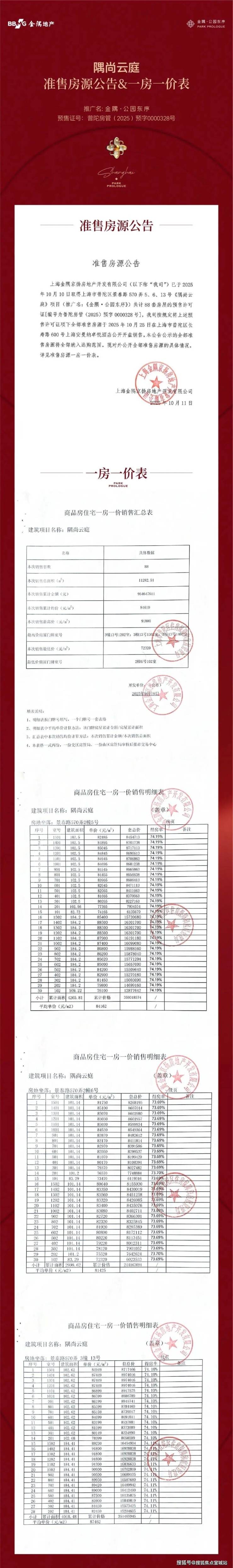 最新消息:一房一价表发布!普陀桃浦「金隅公园东序」已取证,明天开始认购!建面约101-184㎡三房四房,均价84610元/㎡!