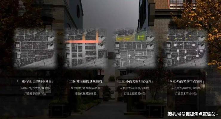 从城市界面到节点空间,由大到小打造“四重空间感受”,营造中西和鸣的感官体验。从华而美的城市道路、糅而谐的景观轴线,美而精的归家巷弄、雅而巧的节点空间,每一处场景皆实现私密与艺术的交融,感受城市繁华与归家宁静的交叠。
