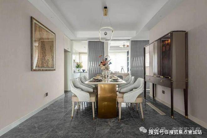 餐厅相当阔绰,可放置六人桌或八人桌。餐厅右侧的凹槽空间,可以作为冰箱、柜体等安置点或储物空间,更方便日常收纳。