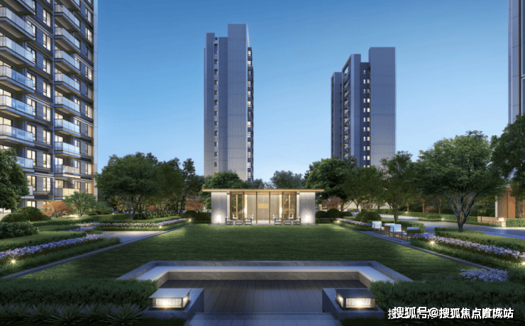 项目采用香槟金搭配银色铝板外立面,天幕美学灯塔;社区恢弘迎宾楼,仪仗归家。