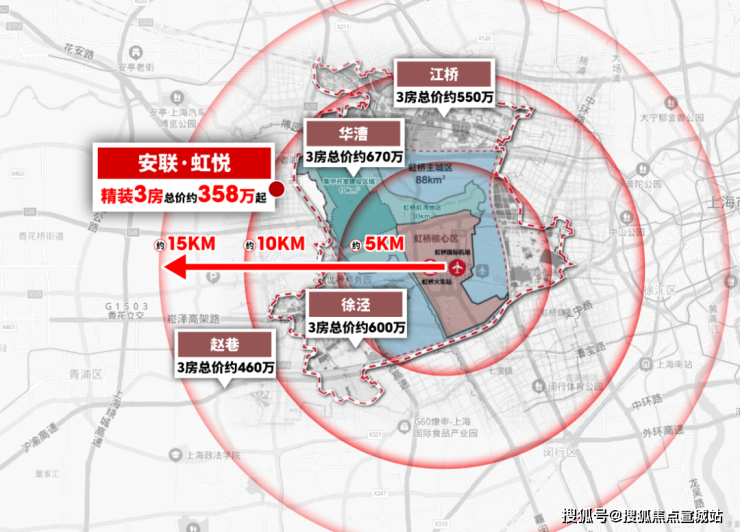 以虹桥火车站为圆点,10公里为半径,几乎所有板块新房价格都逼近甚至超过6万/㎡,4字头的华新甚至比二线辐射板块赵巷还要实惠!