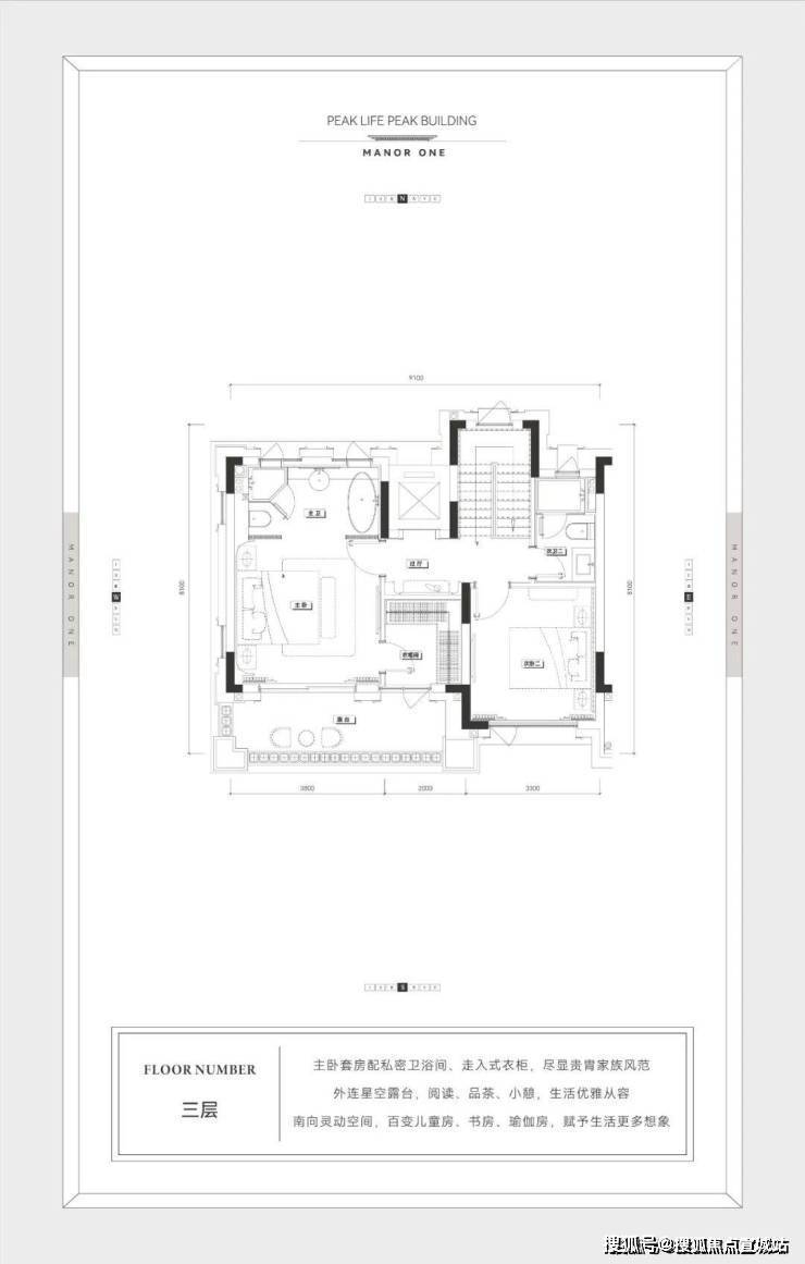 二三楼可以设计为次卧+次卫+超大套房的功能布局。套房中,放得下浴缸的卫生间和走入式衣帽间,才是「享受生活」的最佳标准。而南向的景观露台,则是赏花观景、沏茶品茗的私享天地。