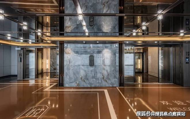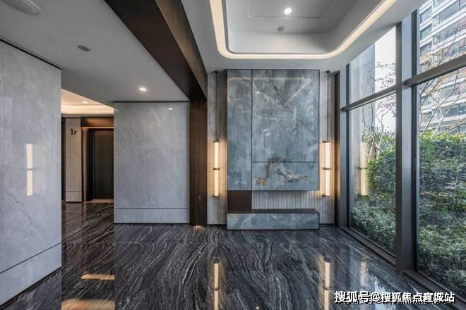 鉴国际豪宅灵感,定制卡塔青玉岩板、鱼肚灰石材拉槽造型、门套、古铜色不锈钢饰面,配以大规格云纹地砖和悬浮吊顶,打造高配入户大堂,以专属的优雅艺术品位彰显贵气。