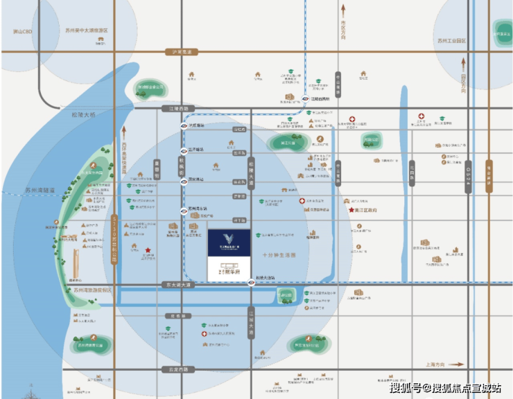 商业配套:自带约 4.5 万方精品商业,后期由苏州恒泰自主招商运营。此外,北侧 1 公里内有吾悦广场、华润万象汇、爱琴海购物公园,2.5 公里左右还有砂之船奥特莱斯,能充分满足业主购物、休闲等多样需求。