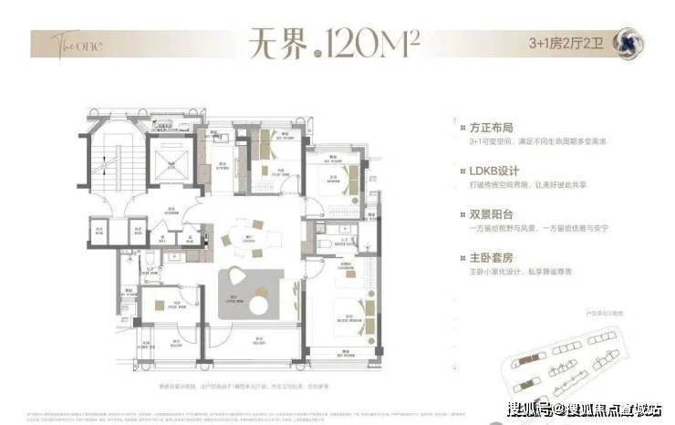 120㎡户型:双阳台、多飘窗、花池设计,独立电梯厅,实得率提升至90%以上。三个卧室空间互不相邻,主卧套房面积超20㎡,北侧X空间可作书房。