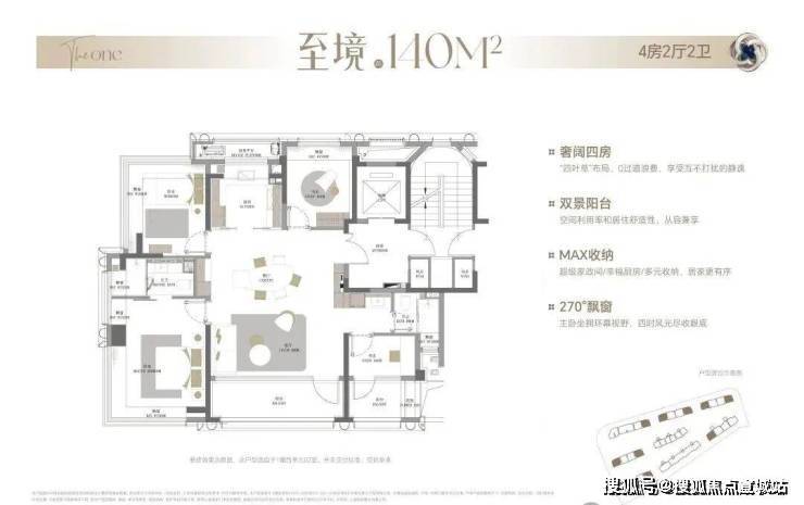 140㎡户型:边套设计,四叶草式布局(四个卧室分置角落,互不干扰),主卧与北次卧配备270°转角飘窗,实得率更高。