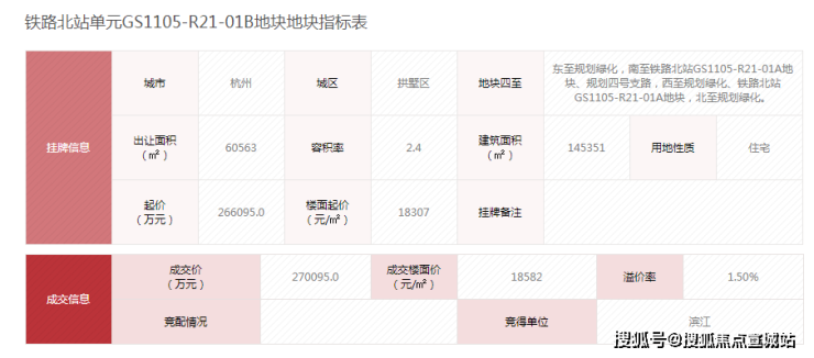 2022年04月25日,经过5轮竞价,杭州滨江房产集团股份有限公司以总价270095万元竞得杭政储出[2022]5号铁路北站单元GS1105-R21-01B地块,楼面价18582元/㎡,溢价率1.50%;配套公建不大于6%,配建医疗服务站等共2570㎡。本宗地块所建商品住房毛坯销售均价不高于30500元/平方米,且毛坯销售最高单价不高于33550元/平方米。如实施装修销售的,装修价格不高于3500元/平方米。