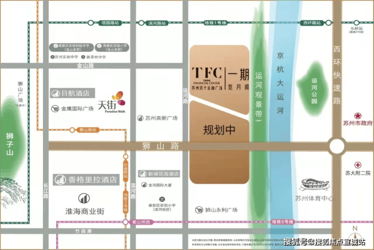 本项目在狮山桥下,京杭大运河旁,占据了新区狮山板块的核心地段,坐享新区繁华商圈,紧邻姑苏古城风韵,集人文精神和高品质生活为一体,将打造为狮山板块乃至苏州市具有代表性的地标建筑。