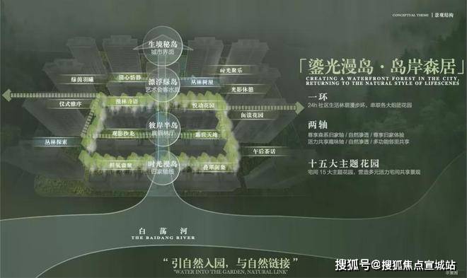 以“山水聚场”理念,规划“一环两轴十五园”景观布局,将水岸、岛屿、森林、花园、树屋作为园林节点,形成“行在景中、坐在岛中、游在林中、意在境中”的美学表达,营造出沉浸式山水活力场域。