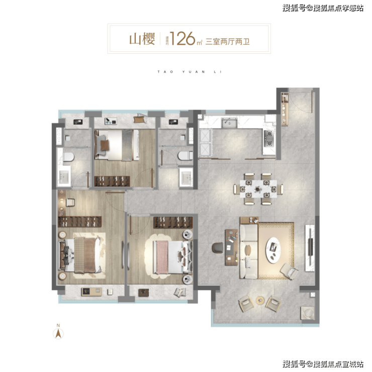 中环·桃源里✪✪售楼处电话✅✅:400-8123-224☎️☎️建面约126㎡大三房与紧凑四房相比,每个卧室尺度感舒适太多,尤其是社交空间,大横厅配大阳台,整个社交空间方正大气,餐厅还能放置六人桌供大家庭进餐。