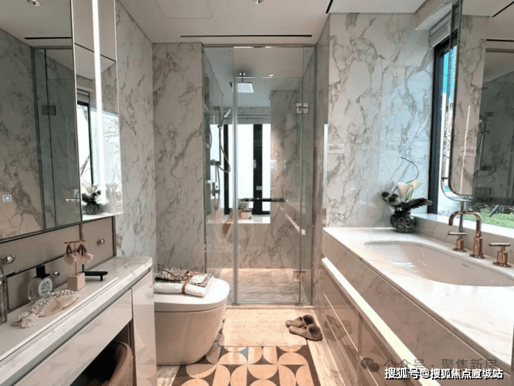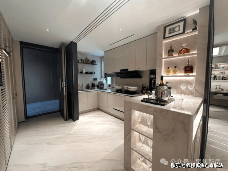 收纳细节上,二期户型中完美继承了一期的收纳系统,玄关收纳,整面内嵌柜体一直延伸到餐边柜;厨房全屋定制的柜体;卫浴的镜面柜和美妆冰箱等等,主卧卫生间的进一步升级:洗手台与化妆台相对,拥有三面镜柜,视觉空间进一步扩展和延伸。