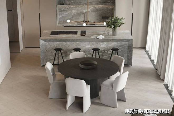 苏州上华璟庭售楼处电话☎:400-8828-814(售楼处预约看房热线)餐厅与厨房位于客厅的旁边,开放式的设计很好地利用了不大的公共空间,给人开阔的视觉感受.光线透过落地窗照入室内,让空间更加明亮.木质的圆形餐桌搭配上上方的金属吊灯,显得柔和而有质感.中岛台选用灰色大理石材质,与整体空间完美融合.