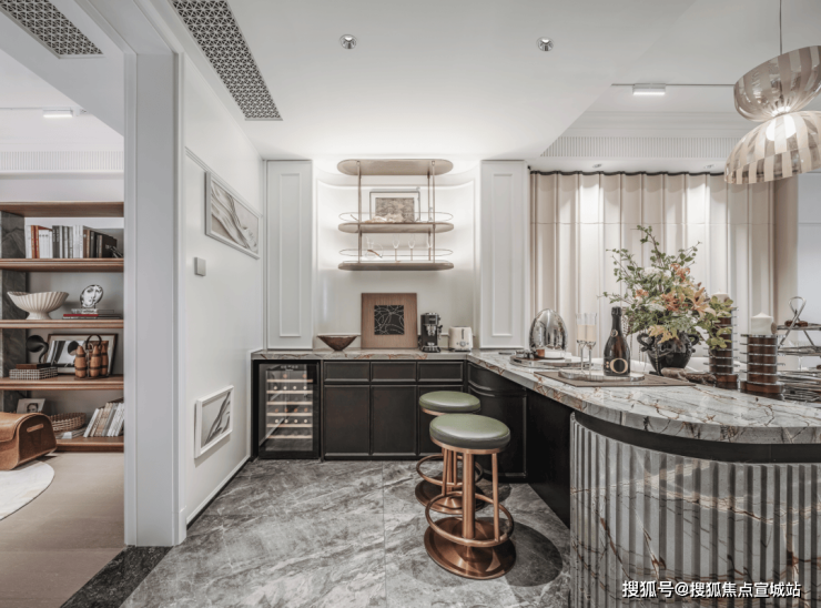 更好更奢的归家门庭,嘉佩乐酒店风格,海派元素充满空间的每一个角落,地面的复古花纹,金属镂空装饰墙,普拉达绿的奢石点缀,仿佛穿越到了摩登时代。